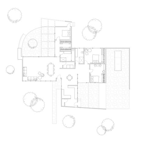CSH 6 by Richard Neutra, conceived 1945. Commonly known as the 'Omega' house, this design is the conceptual complement to CSH 13 the 'Alpha'. Both were imagined to be adjacent to each other and occupied by two close families.